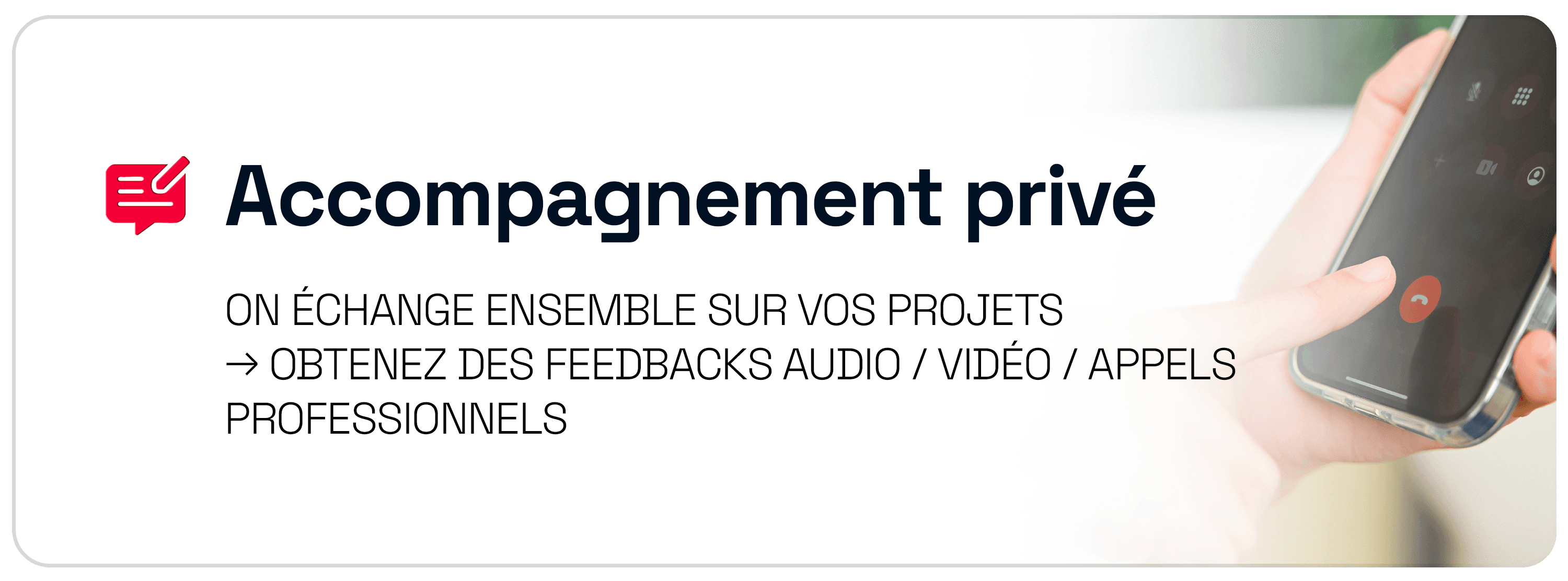 Recevez des retours personnalisés sur vos projets, sous forme de feedback en appel, en audio ou vidéo, pour progresser concrètement chaque semaine.